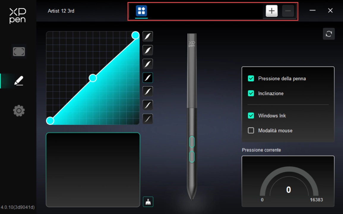 Regolare la curva di pressione della penna o selezionare un'opzione di sensibilità della pressione preimpostata.