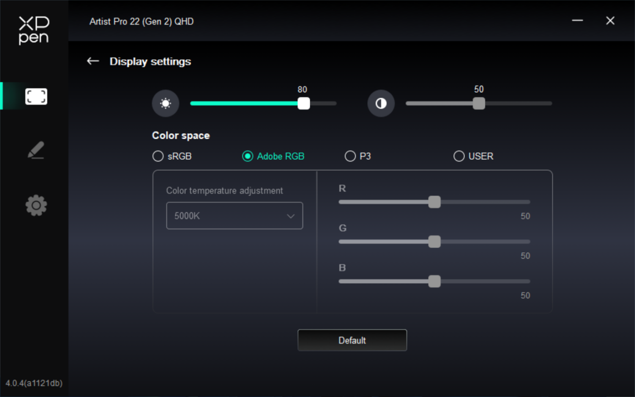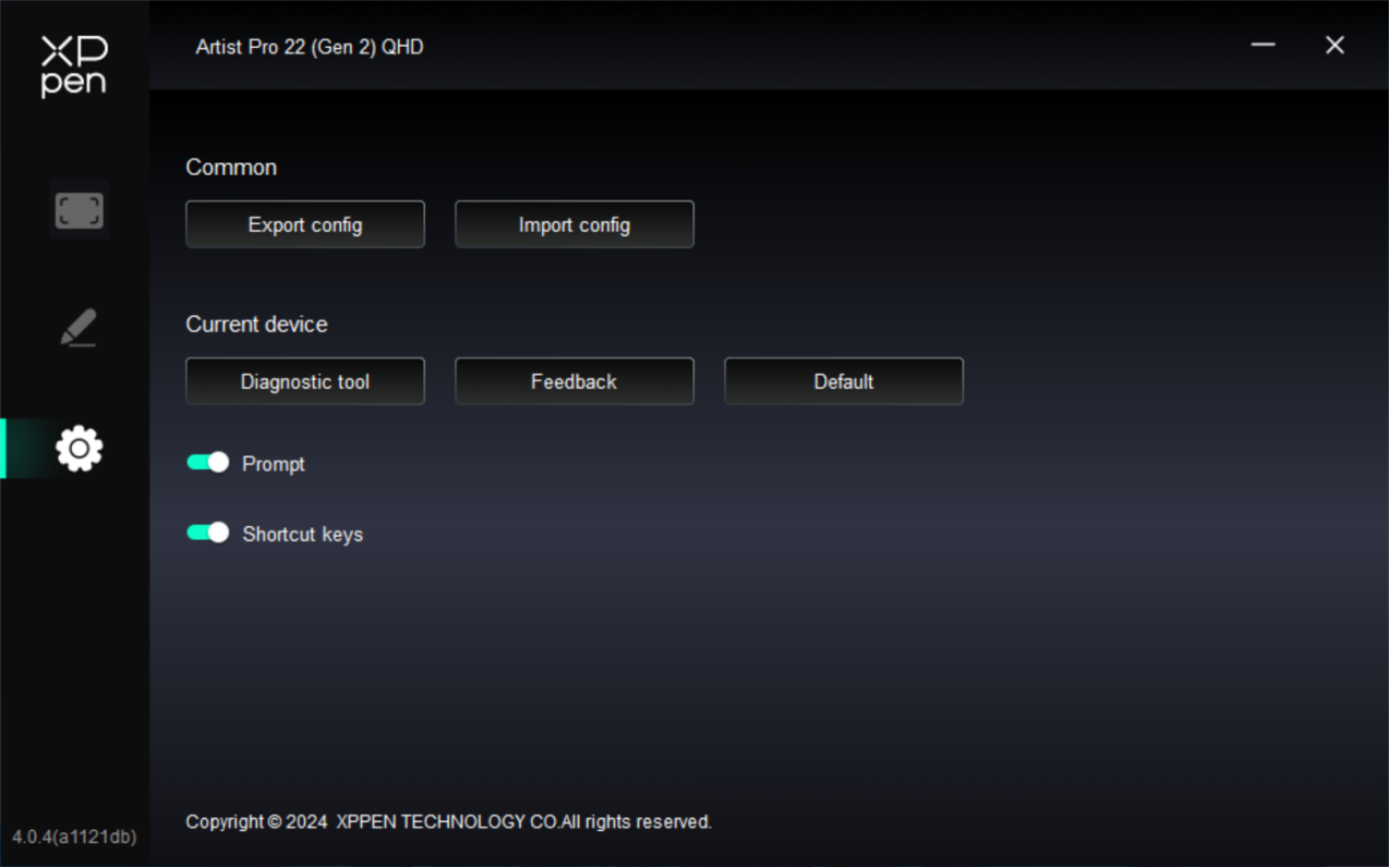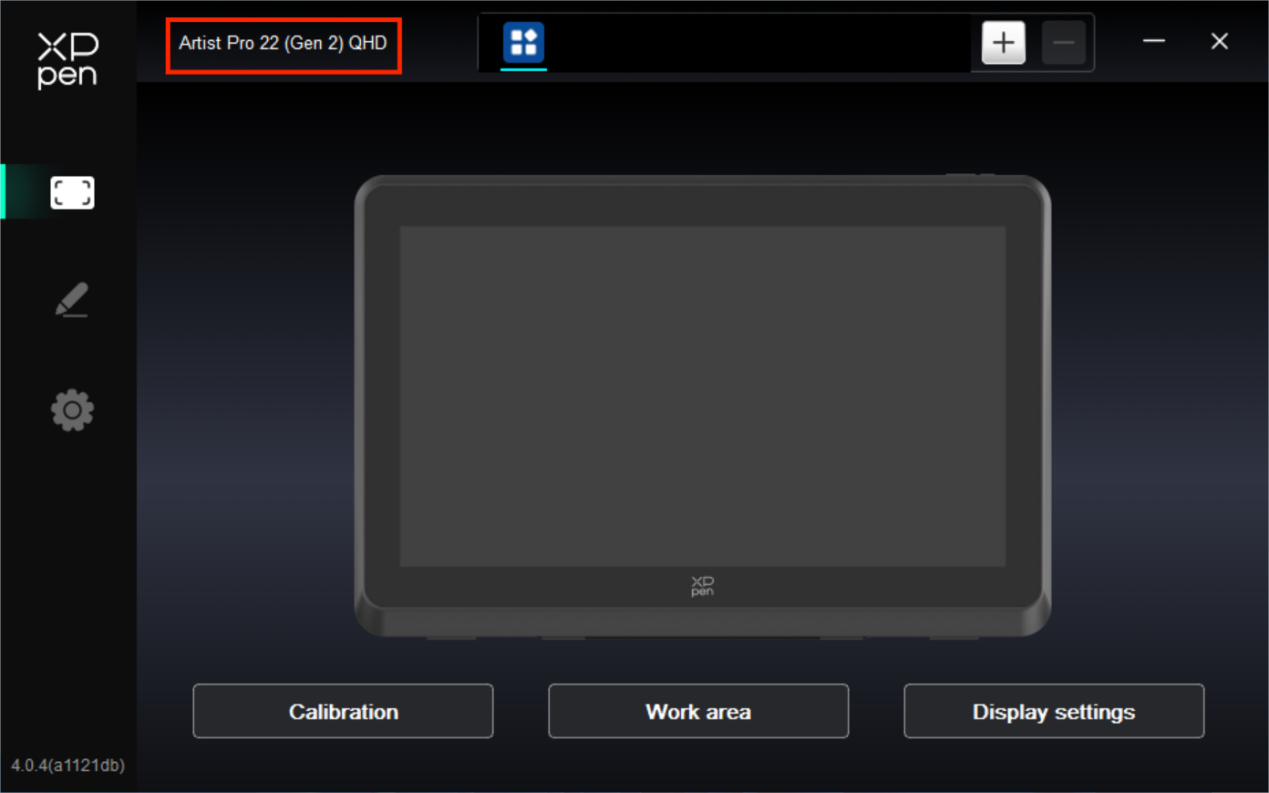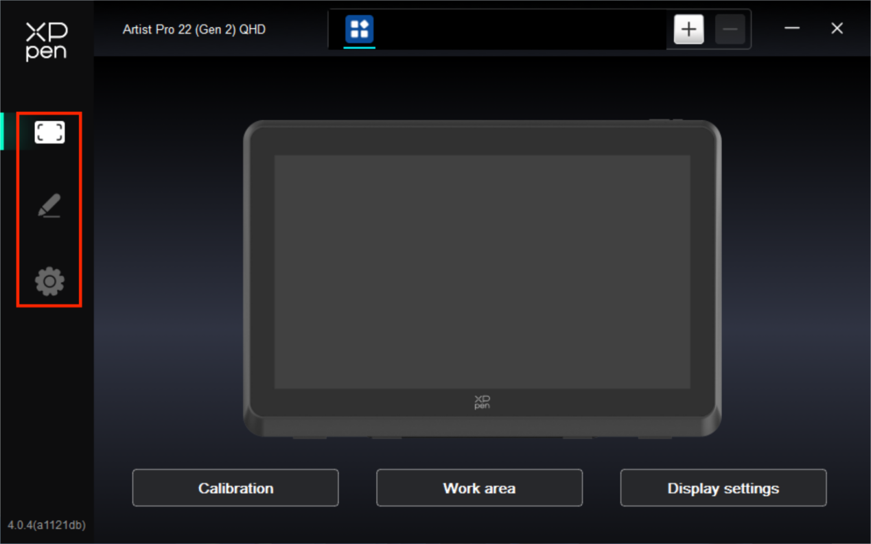 Fare clic sulle icone nella barra dei menu a sinistra per passare da una funzione di unità all'altra. Dall'alto verso il basso, le opzioni sono Impostazioni del dispositivo, Impostazioni della penna e Impostazioni Driver.