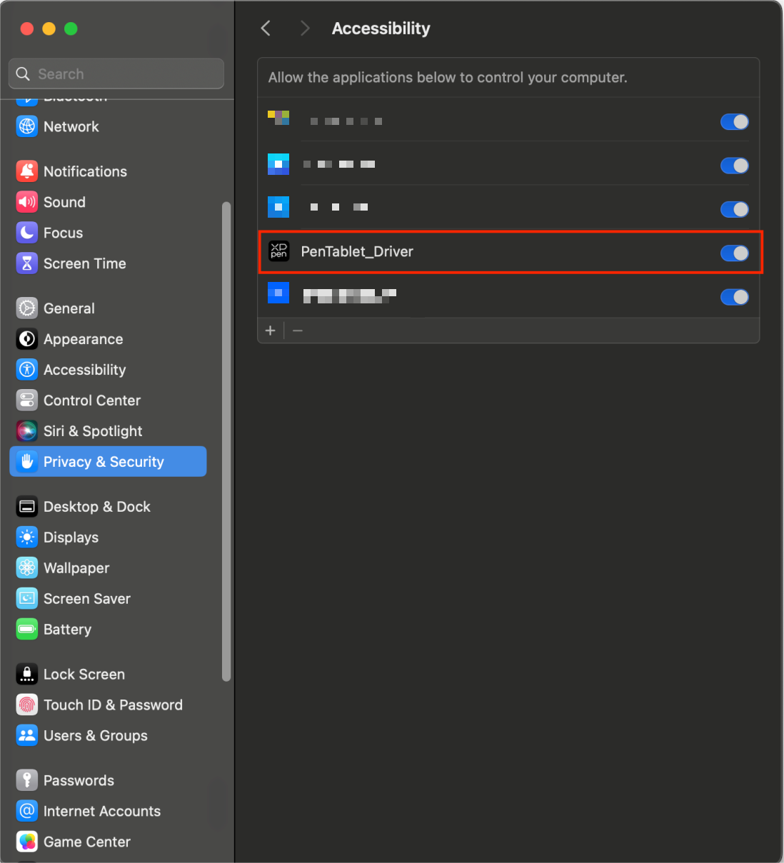 Decomprimere il file, eseguire il file "pkg" e seguire le istruzioni per completare l'installazione. Andare a Impostazioni di sistema -> Privacy e sicurezza -> Accessibilità, assicurarsi che l'opzione PenTabletDriver sia selezionata; in caso contrario, il dispositivo e il driver potrebbero non funzionare correttamente.