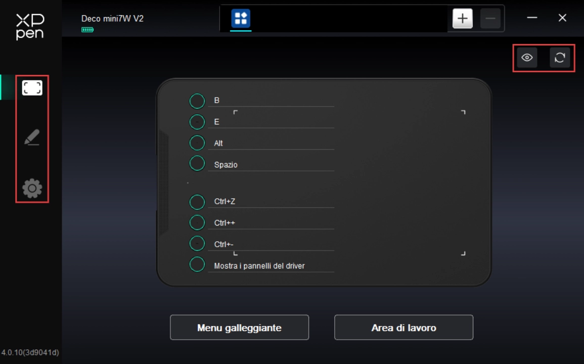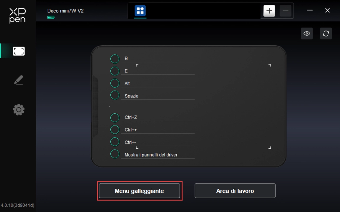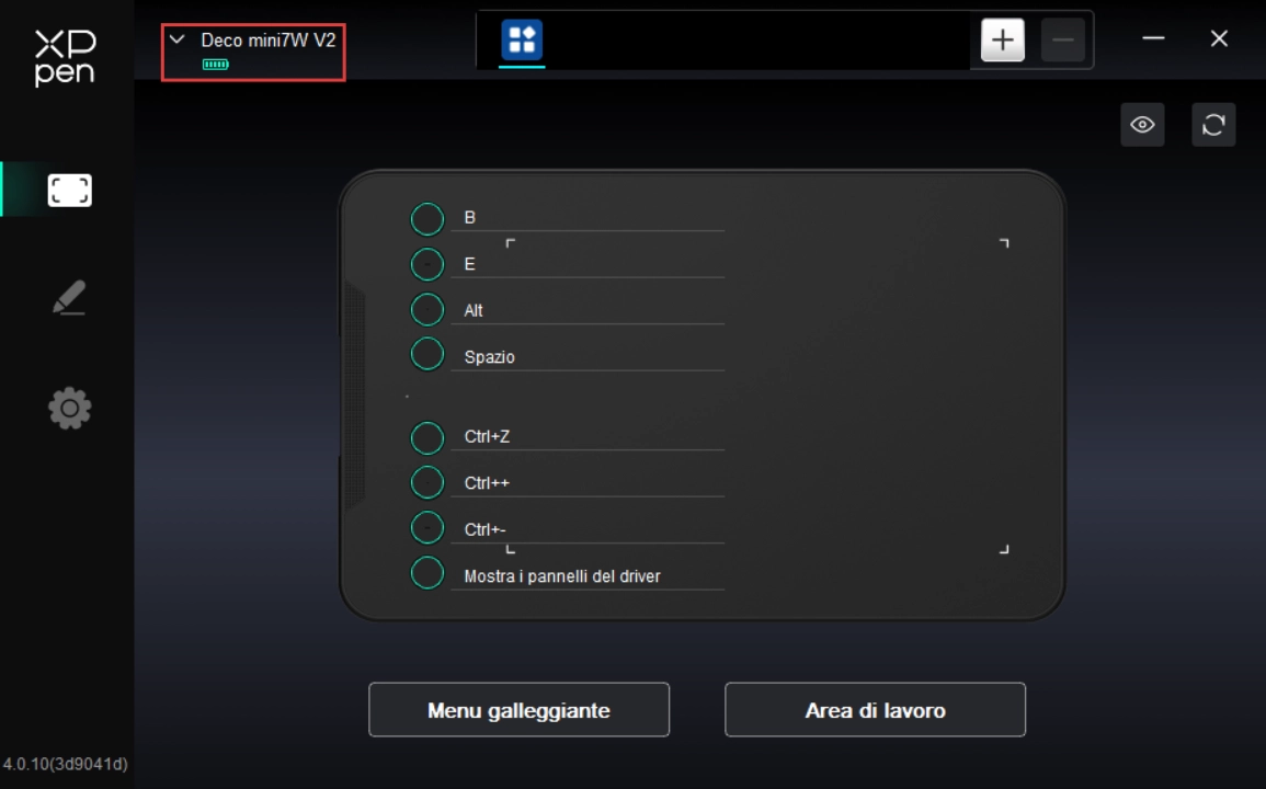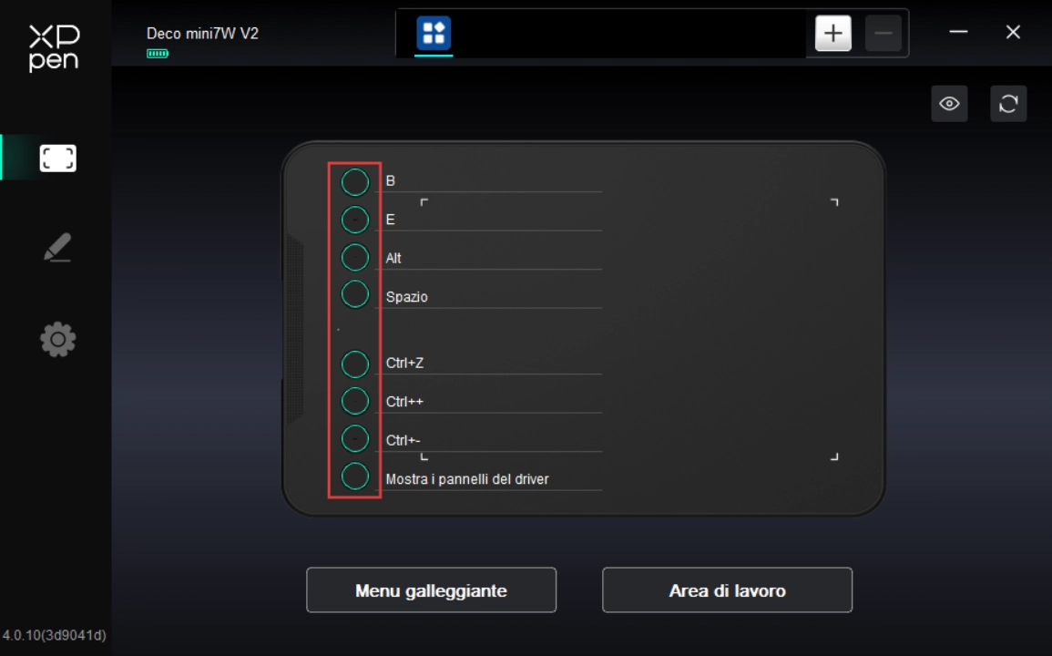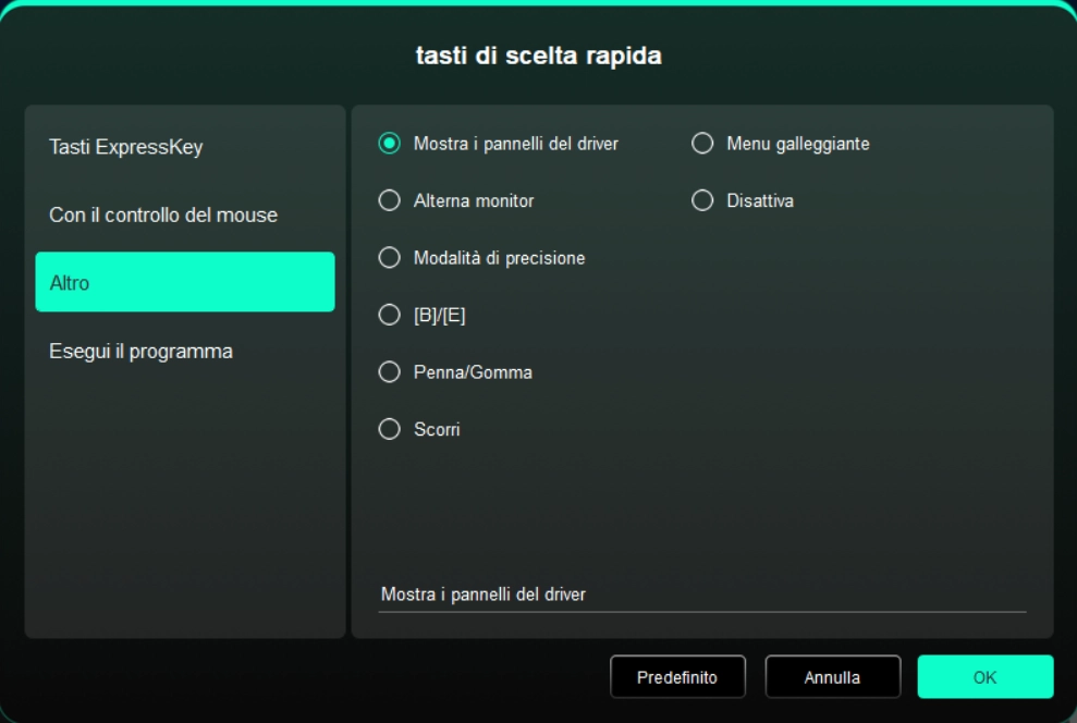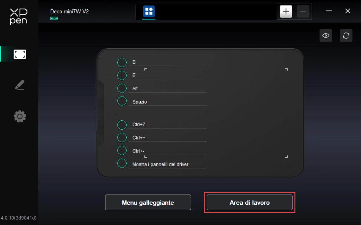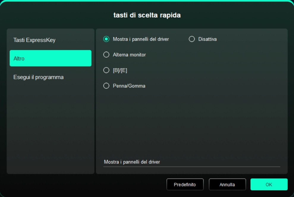 I tasti di scelta rapida e la ghiera sulla tavoletta grafica sono temporaneamente non disponibili. Le impostazioni del driver sono temporaneamente non disponibili, quindi l'area della mappatura non può essere personalizzata.