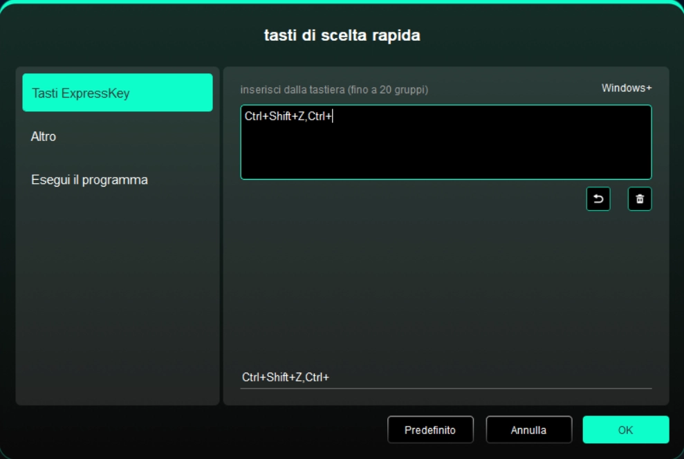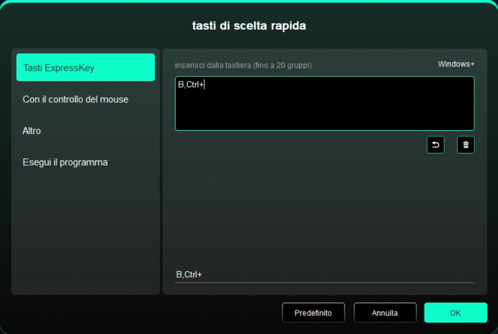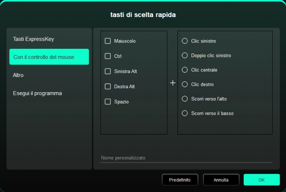 È possibile impostare la combinazione di tasti "tastiera + mouse": ad esempio, dopo aver scelto "Shift" e "Clic", è possibile effettuare questa operazione di scelta rapida nel software che supporta questa combinazione di tasti.