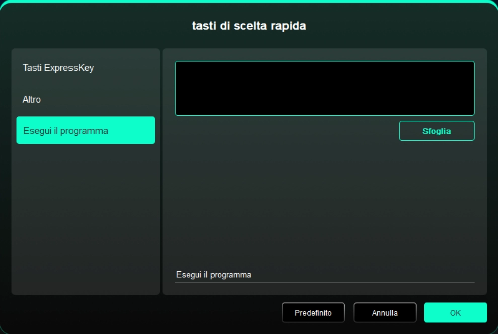 Ad esempio, se si seleziona un'applicazione e sene modifica la configurazione, le modifiche avranno effetto solo mentre si utilizza quell'applicazione. Il driver riconoscerà automaticamente quando si passa da un'applicazione all'altra. È possibile aggiungere fino a 7 applicazioni.