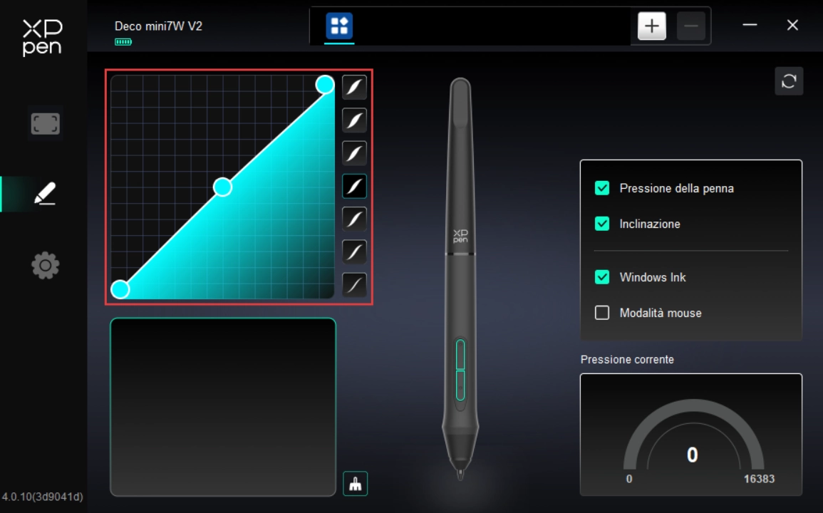 Regolare la curva di pressione della penna o selezionare un'opzione di sensibilità della pressione preimpostata.