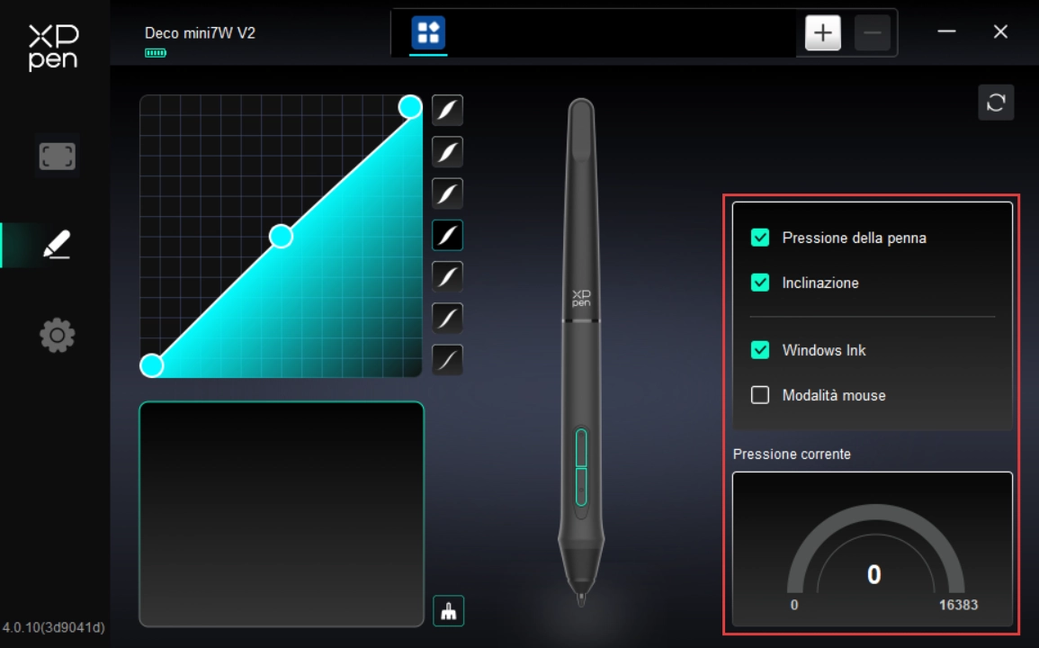 6) Se il test della pressione della penna è normale (Windows: nell'interfaccia delle impostazioni della penna del driver, assicurarsi che Windows Ink sia attivato), accendere il software di disegno per eseguire il test.